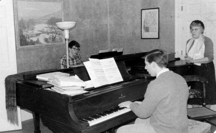 Playing on the 2 pianos of Senator Ralph Flanders (R) with his nephew Jon (left), me (center) and his aunt (right). I believe Jon was working on the Rimsky-Korsakov Piano Concerto and I was playing the orchestral reduction.